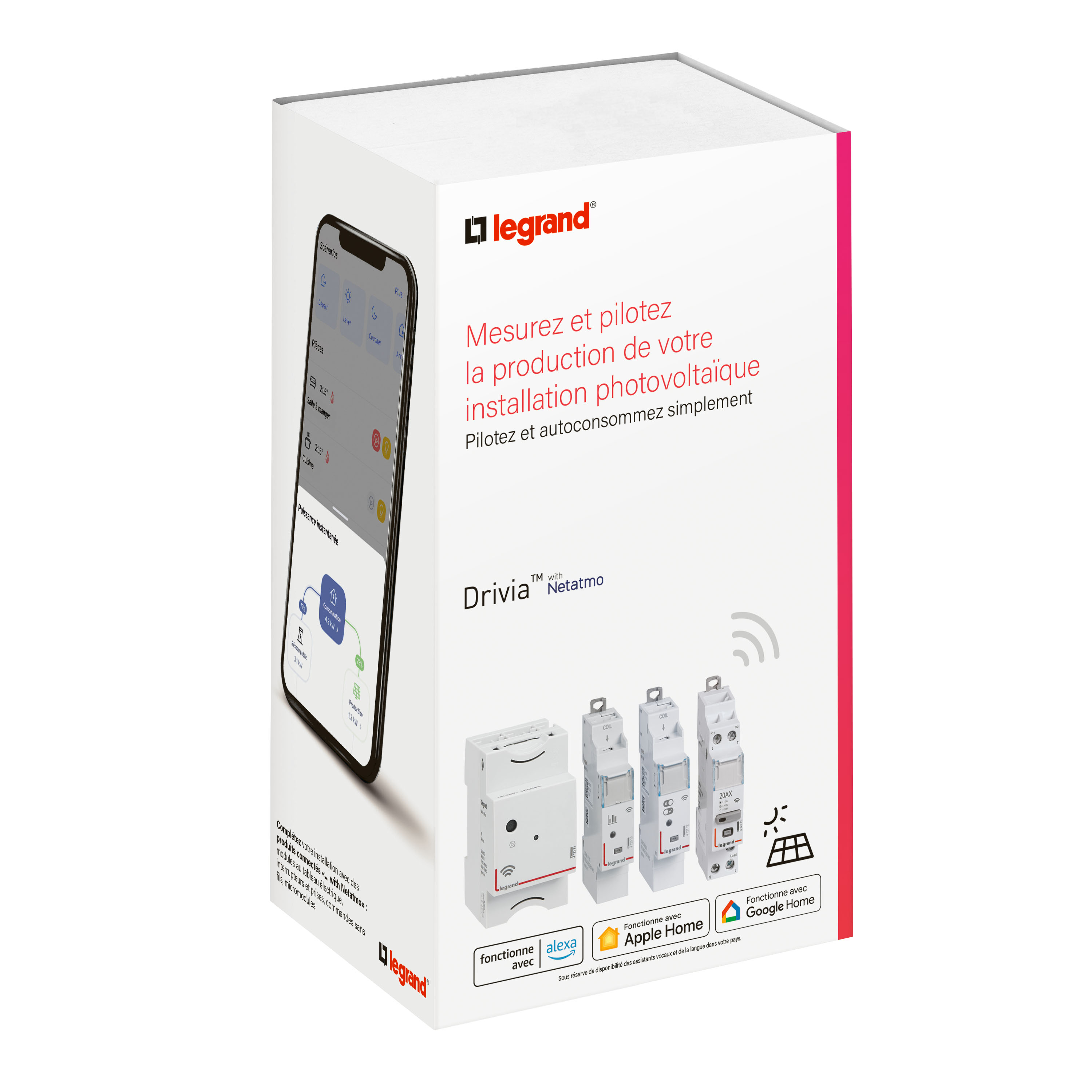 - Pack de démarrage Drivia with Netatmo composé de :- 1 délesteur connecté réf. 412172 pour la mesure de la consommation du logement- 1 module de mesure monophasé connecté réf. 412015 pour la mesure de la production solaire- 1 contacteur connecté multifonction, silencieux 20AX - 230V~ - 50Hz référence 412171 pour une utilisation optimisée de l'énergie solaire (automatisme)- 1 module Control 100V~ à 240V~- 50Hz à 60Hz référence 412181 pour connecter l'installation