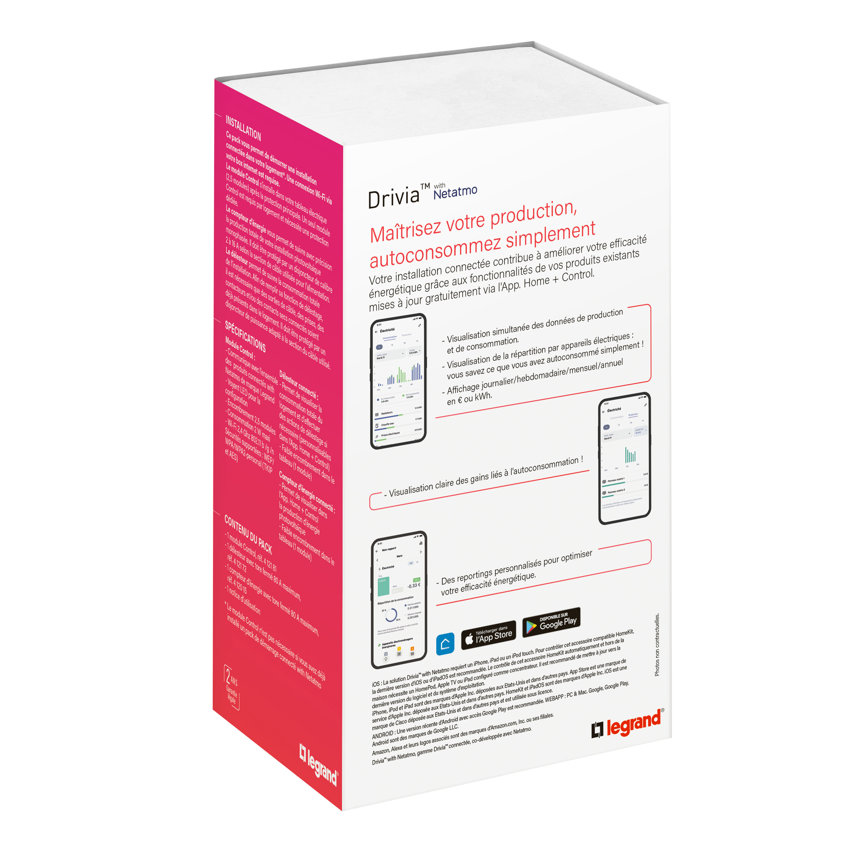 Drivia with Netatmo, le pack de démarrage permet de mesurer et de suivre via l'Application Home + Control la production d'une installation photovoltaïque monophasée et la consommation totale d'énergie