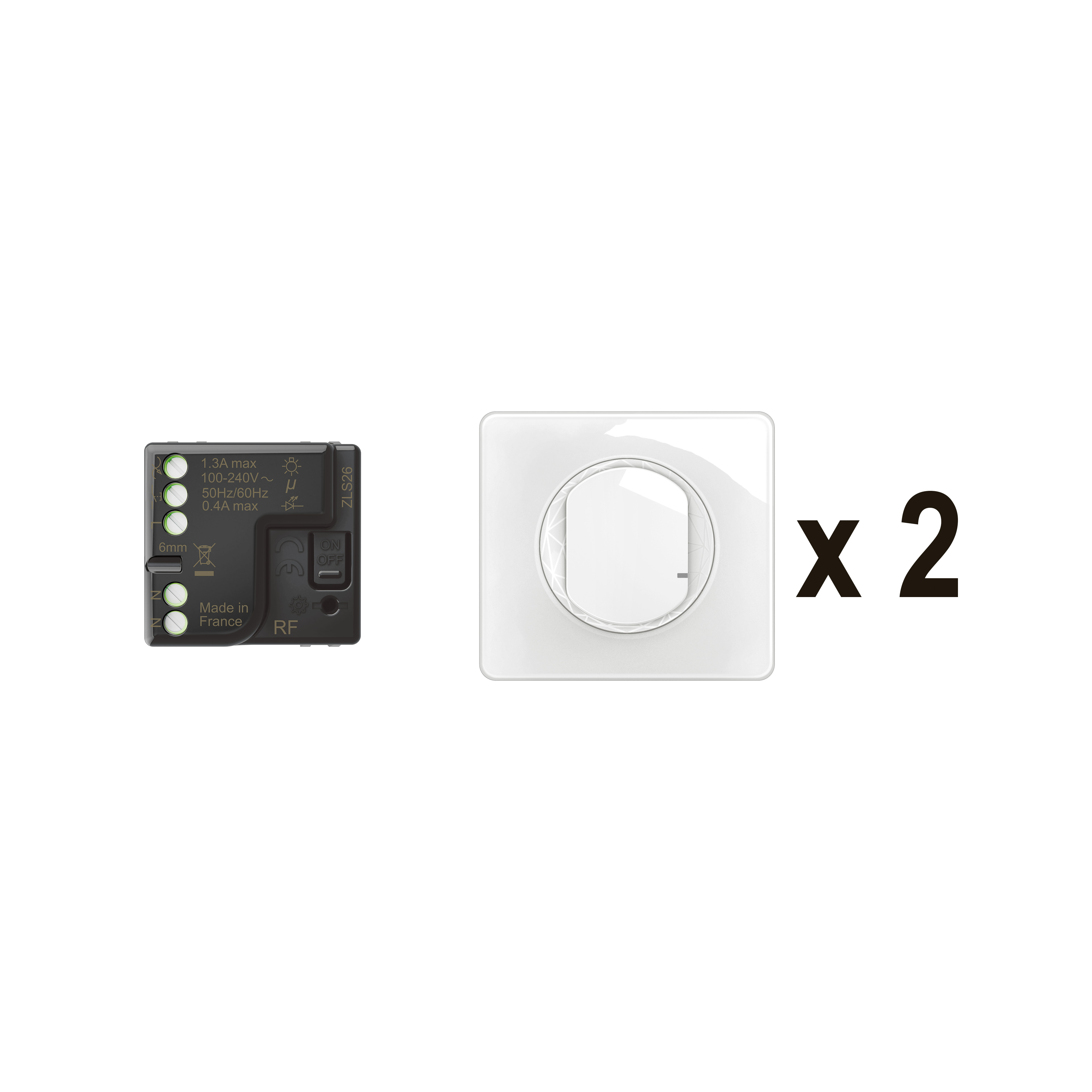 - 1 micromodule d'éclairage ON/OFF 230 V~ (100 W LED), s'installe dans une DCL au plafond, une boîte de dérivation ou des appliques murales