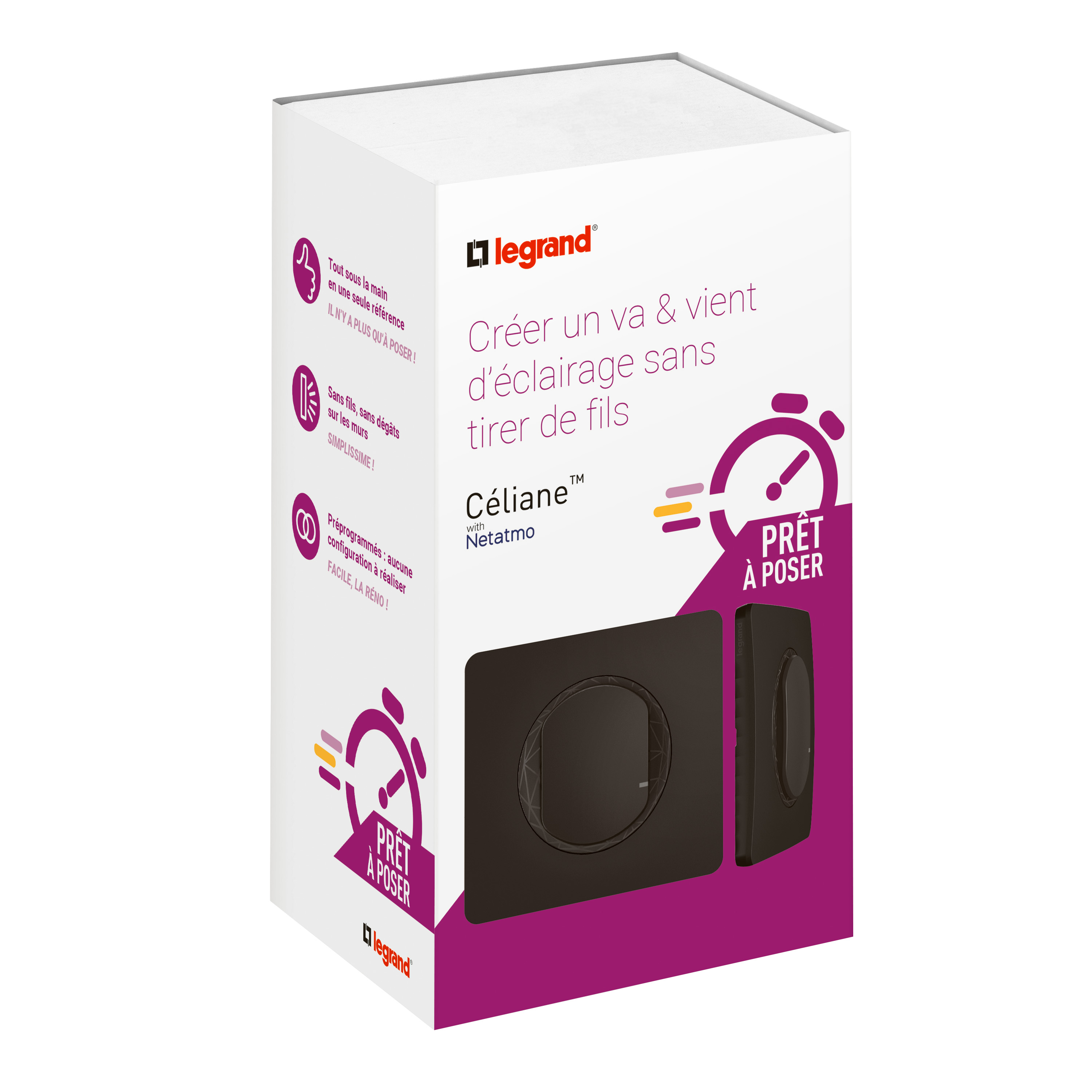 - Installation évolutive : en associant le Prêt-à-Poser à un pack de démarrage, les produits pourront être contrôlés via l'App. Home + Control et par la voix - Le mode variation de l'interrupteur pourra également être activé