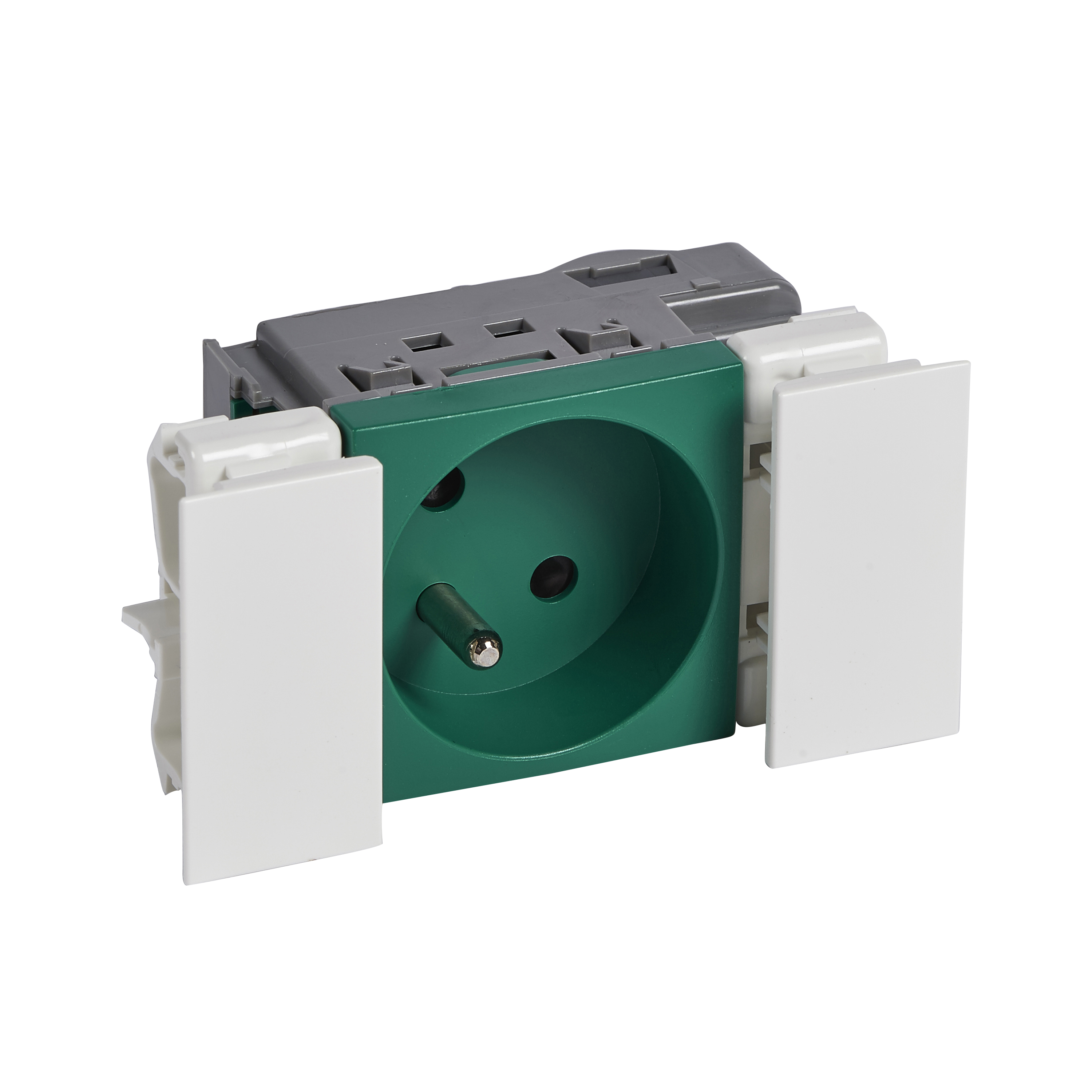 Prise 2P+T Logix-2 modules-16A-250V-Inclinée 45°-Alimentation bloc multiprise-Bornes auto-Equipée Normaclips-Compatible avec les supports d'installation Logix : boîte de sol, bloc bureau, pop'up, goulotte, colonne et colonnette-Vert RAL6016