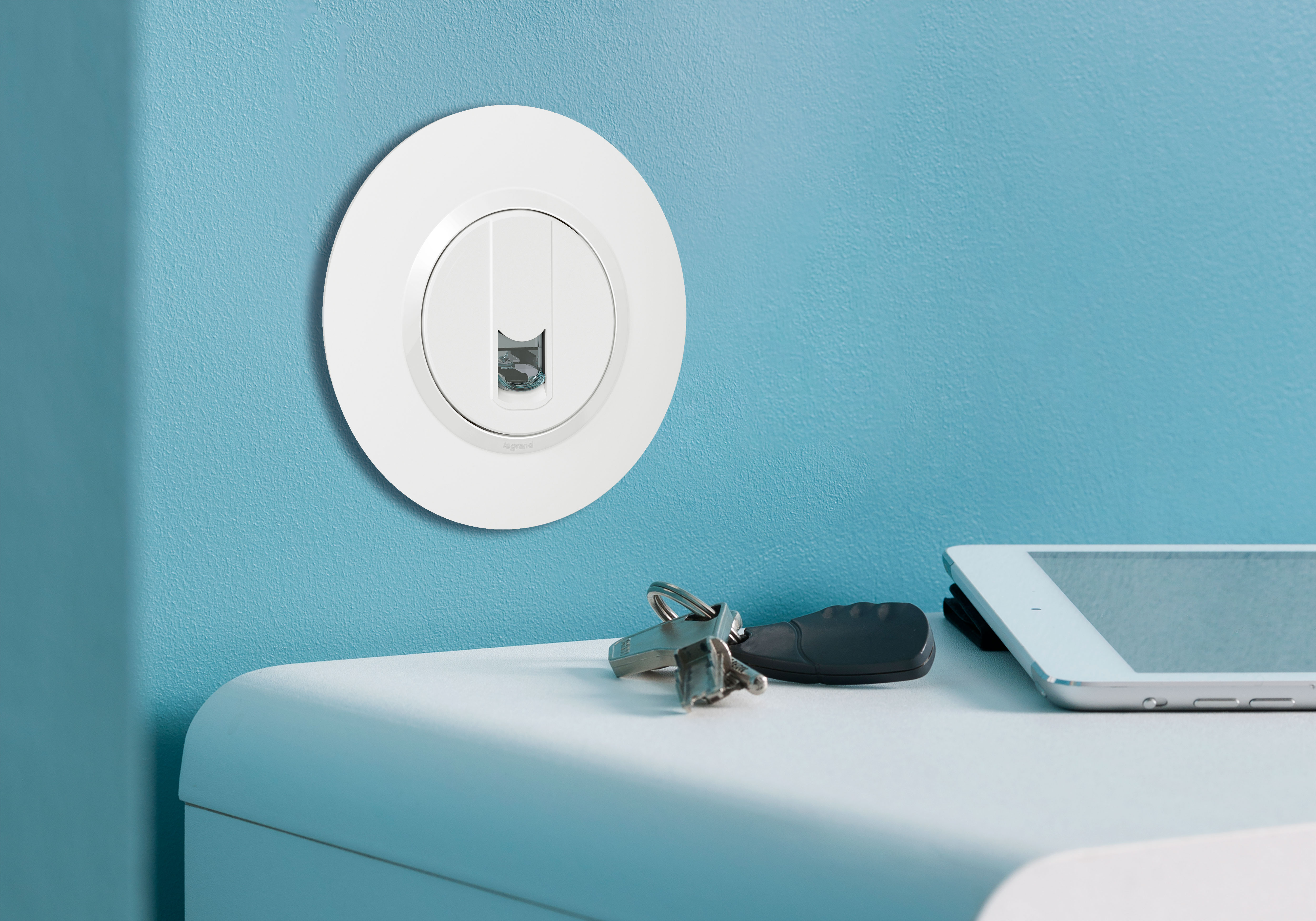 dooxie, une prise RJ45 avec support permettant un rattrapage en cas de dérive de pose de la boîte d’encastrement, à équiper d'une plaque avec un design dans l'air du temps