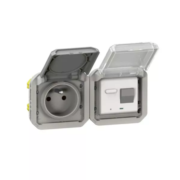 Prise de courant à volet et disjoncteur différentiel 30mA étanche Plexo 16A 250V IP55 2 postes enjoliveurs finition gris
