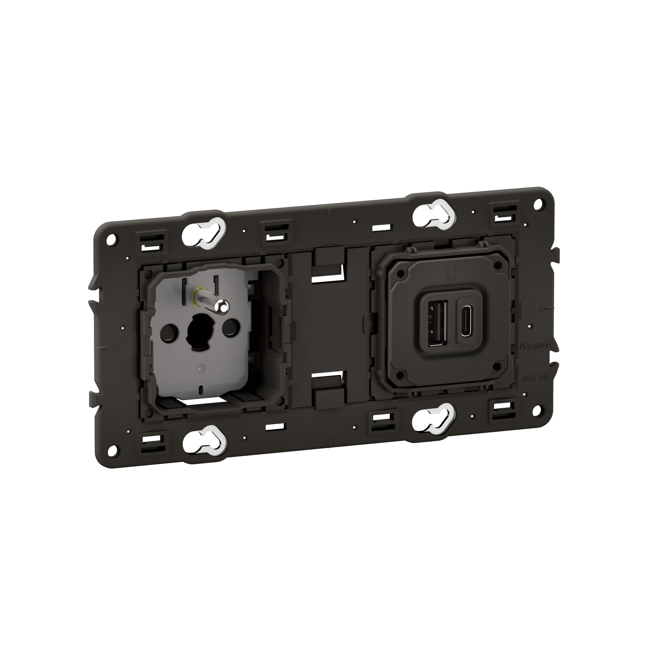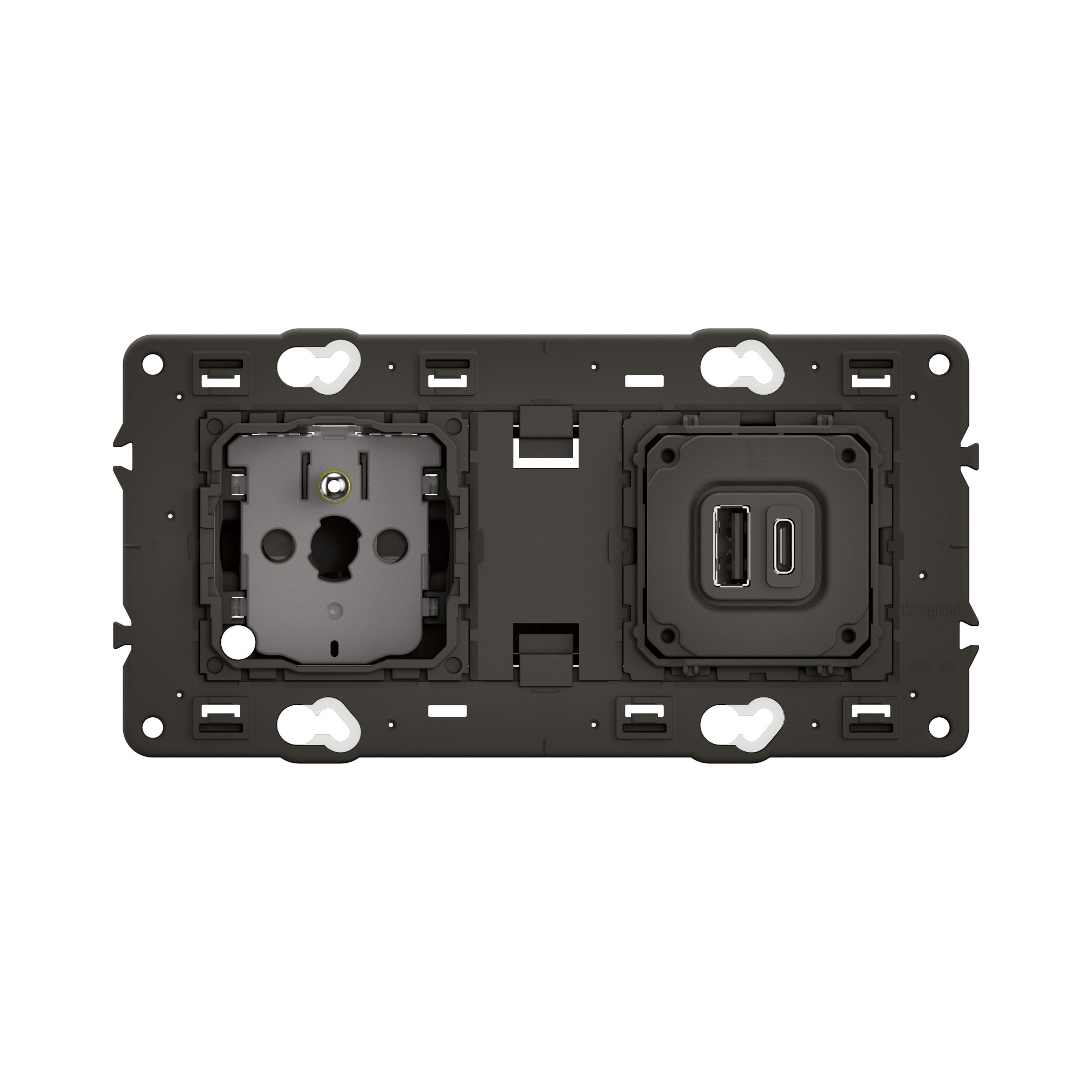 Double prise 2P+T et USB précâblée Céliane avec peigne Rapido montées sur support 2 postes, à combiner avec 2 enjoliveurs et une plaque de finition 2 postes