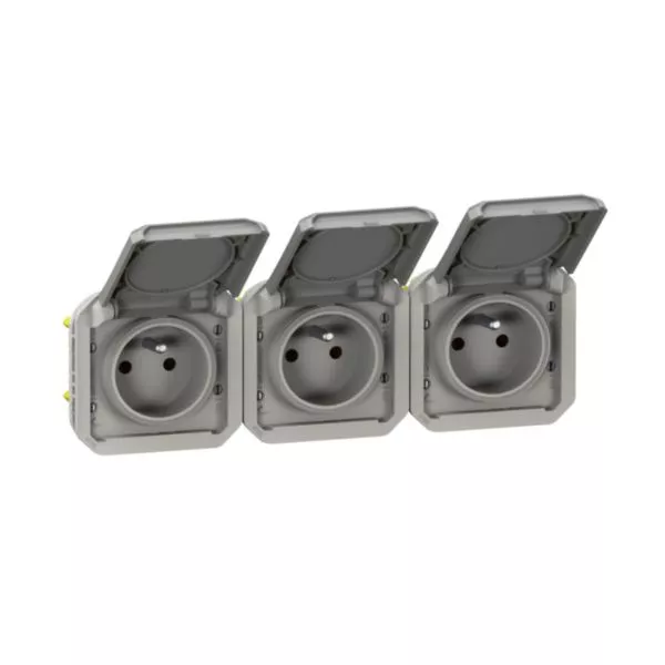 Triple prise de courant précâblée 3x2P+T horizontale étanche Plexo 16A 250V IP55 3 postes avec enjoliveurs gris
