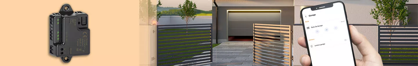 Le module connecté pour porte de garage ou portail (livré avec 2 capteurs de position filaires) se raccorde à tous types de moteurs.