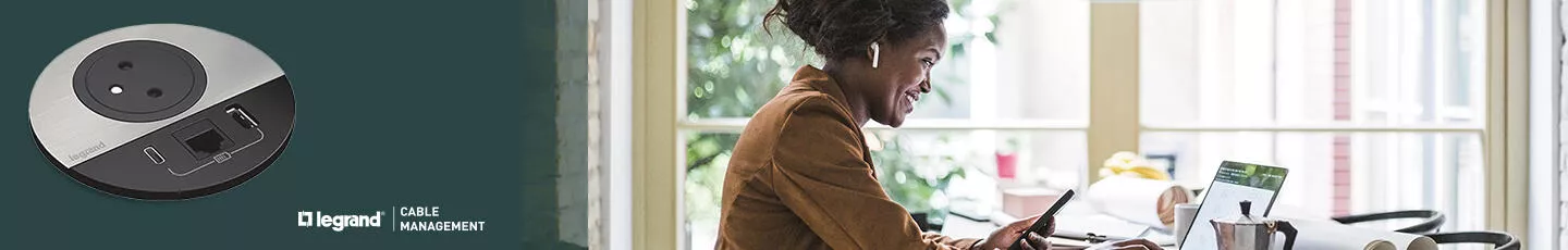 Prises 2P+T Surface, chargeur USB A+ C 15 W et prise RJ 45 cat. 6 FTP ou sortie de câble pour répondre aux besoins de connexion rapide et facile des utilisateurs nomades.